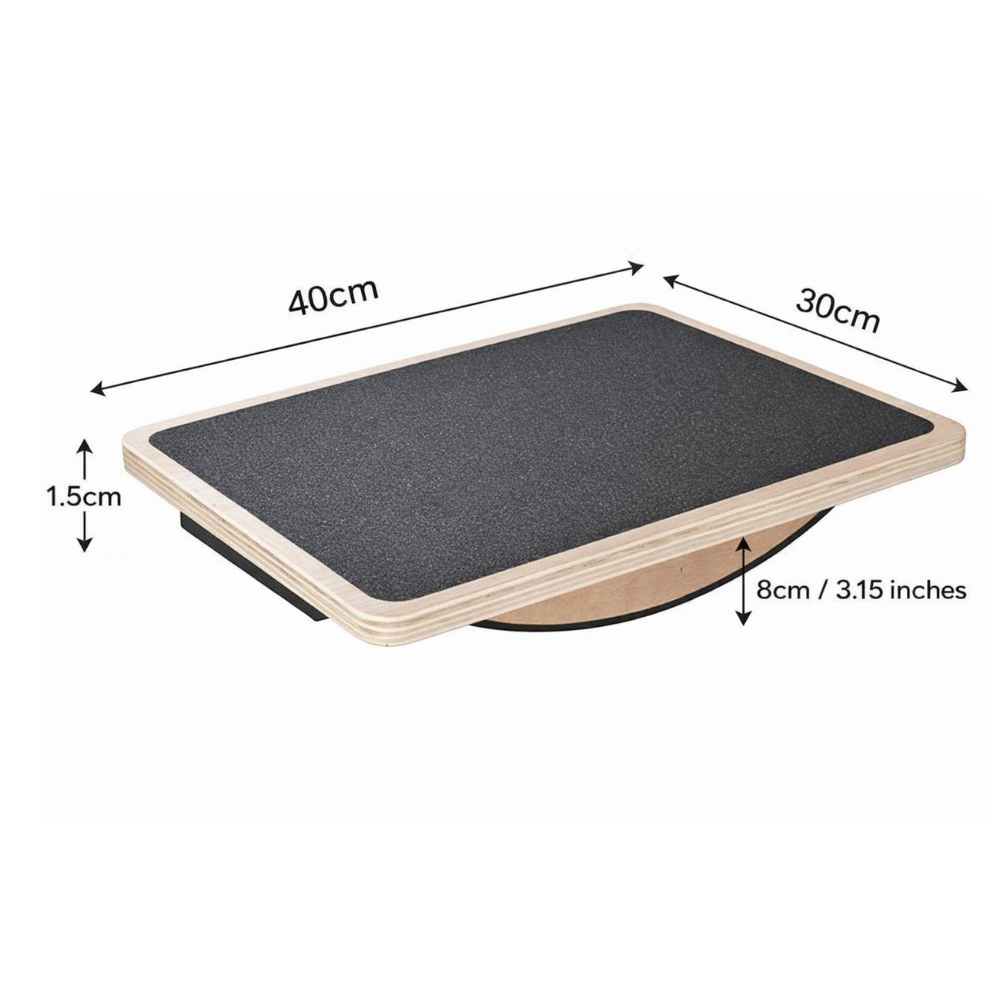 The board is made from durable wood with an anti-slip surface, ensuring stability and safety during use. The curved base allows controlled wobbling movement, which helps activate muscles in the legs, ankles, and core. It is suitable for home workouts, gym training, sports conditioning, and rehabilitation therapy.